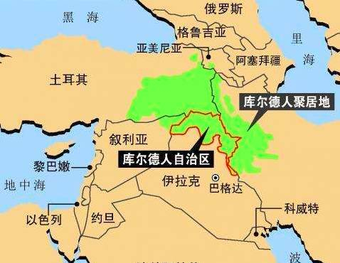 我们再来看一下库尔德人聚集区的地图,下图绿色部分是分布在伊拉克、伊朗、土耳其和叙利亚四国的库尔德人。现在,叙利亚库尔德民主军控制的区域比下图中的绿色部分大得多。所以,真的火候到了,美国完全可能支持这四国的库尔德人打一场独立战争,重新扶植一个更大的“以色列”以分担美国在中东的战略压力。