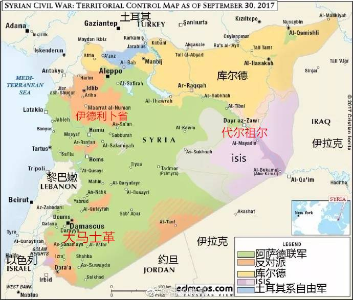 美俄在中东没有任何妥协迹象,都在加快占据占据有利地形,然后展开决战。为了更清楚当前局面,我们先看看9月30日叙利亚势力范围地图: