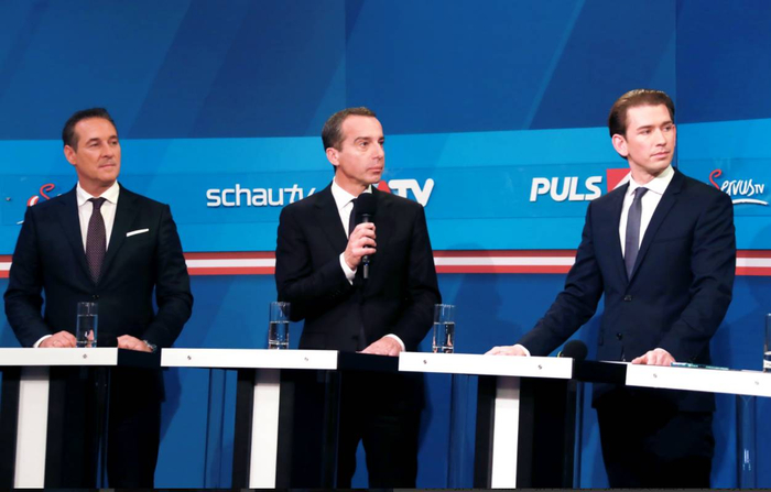 15日,在奥地利首都维也纳举行的各党候选人国民议会选举后的公开亮相上,奥地利外长、人民党主席库尔茨(右),奥地利总理、社民党主席克恩(中)与奥地利自由党主席施特拉赫出席活动。 新华社记者潘旭摄