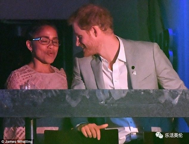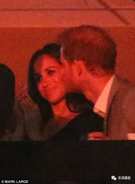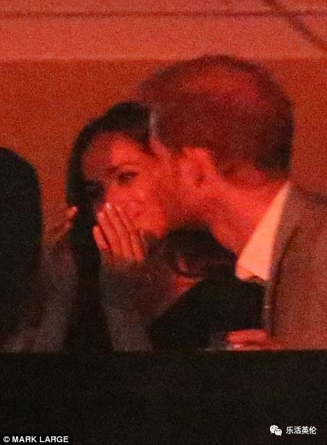 两人在远处一个灯光较暗的VIP包厢里,梅根一脸的娇羞,依偎在哈里王子怀里。
