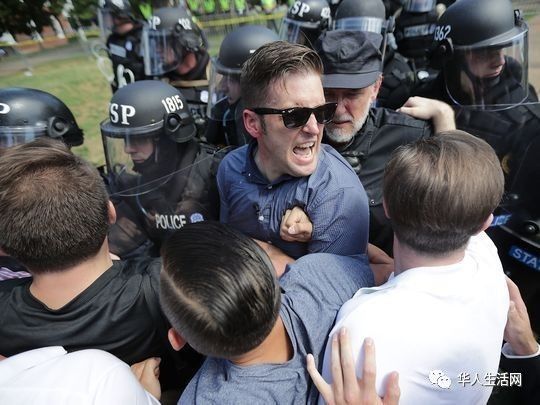 (Richard Spencer(中)和他的支持者与弗吉尼亚州州警发生冲突)