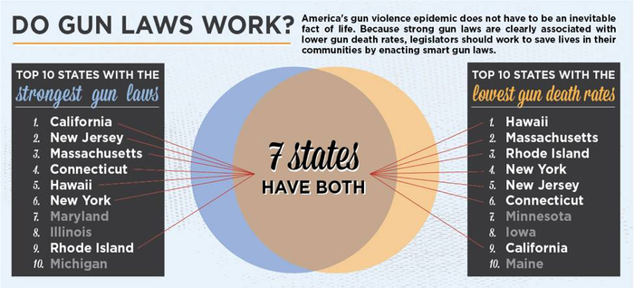 控枪最严的十个州中,有七个州同时也是枪击致死案最少的前十名