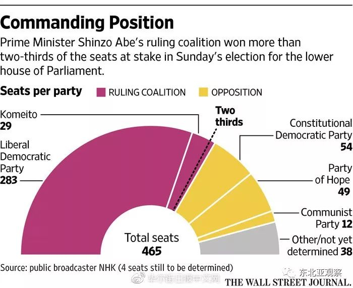 图:日本大选后各政党权力谱,联合执政党掌控(283+29)312席