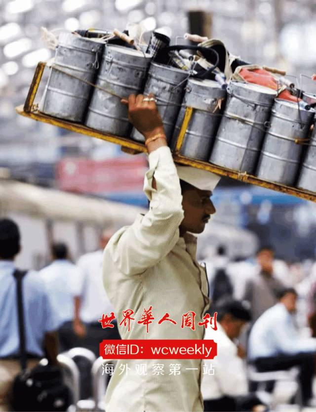 在印度孟买的街头你会看到这样一群人,他们头上顶着一排饭盒,穿梭在拥挤的人群中;