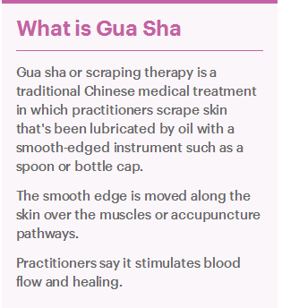 观众旁友大家好~Gua sha,或者刮吧,是中医疗法的一种。医生一般会边缘光滑的工具(如勺子或瓶盖),和着按摩油刮你。一般是沿着肌肉经络或者针灸穴位刮,然后淤血就会表出来,然后你就好啦!