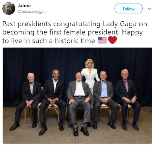 前总统们齐齐祝贺Gaga当上第一位美国女总统。很高兴有生之年见证了这一历史时刻。