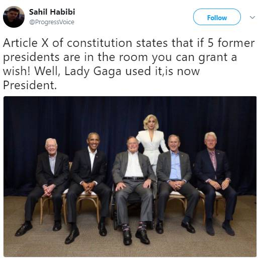 美国宪法第X条规定,集齐5位总统就可以许个愿。Gaga许了个愿,如今她成了美国总统。