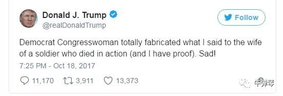 4、特朗普也很愤怒,马上发推特否认:对我与一个士兵家属的谈话,这个民主党女议员完全是在搬弄是非(我有证据的),可悲!