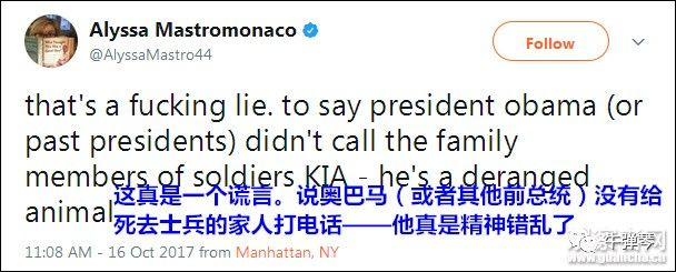 奥巴马前副幕僚长阿丽莎(Alyssa Mastromonaco),更在推特上反驳了特朗普:这真是一个谎言(fucking lie),说奥巴马总统(或其他前总统)没有给死去士兵的家人打电话,他真是一个神经错乱的禽兽(deranged animal)。