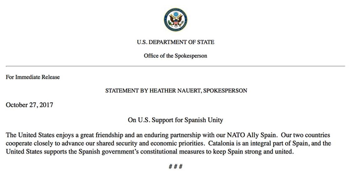 美国国务院女发言人希瑟·诺尔特27日在声明中也表示,美国认为加泰罗尼亚是西班牙的一部分,支持西班牙政府为保持国家强大团结所采取的措施。这些表态的意义重大。“独立在政治、经济和社会意义上都不可行。你不能简简单单因为举行了一次公投就宣布独立——一个国家必须得到联合国的承认,”巴塞罗那自治大学法律教授特蕾莎•弗雷克西斯(Teresa Freixes)说:“没有承认,加泰罗尼亚就会像西撒哈拉、巴勒斯坦,或者北塞浦路斯。这真的是我们想要的吗?”