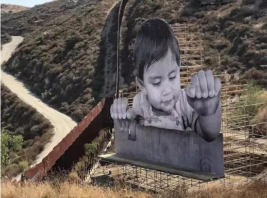 法国艺术家 JR 还在美墨边境上竖起了一个巨幅儿童人像画板,画的是一个小男孩双手搭在墙体上,从墨西哥国土一端好奇地看向美国。JR 用以此来表示对每一个追梦者的支持,认为他们的梦想不应该被任一政治理念或者偏见所阻断。