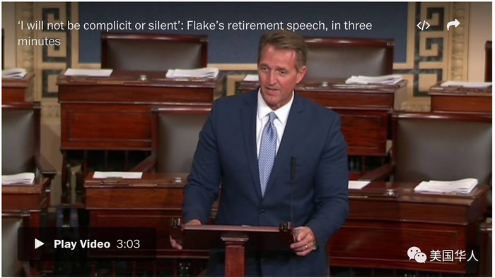 周二,亚利桑那州共和党参议员杰夫·弗莱克(Jeff Flake)在国会发表了措辞激烈的退休演讲,对于美国背离传统价值和理念的一些表现进行了抨击,特别是共和党自己的不作为之风。这是继前总统小布什、参议员约翰·麦凯恩(John McCain)和鲍勃·科克尔(Bob Corker)之后的又一位共和党人站出来批评共和党和川普总统。他们言辞犀利的批评意味着某种程度上与共和党的背离。