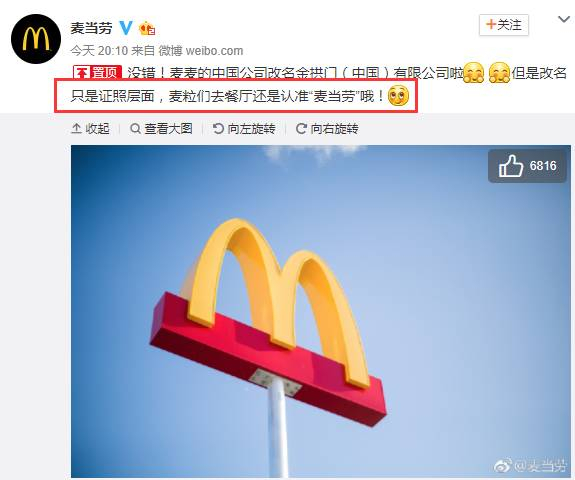 眼看着中国网友为麦当劳改名操碎了心,麦当劳的官方微博也赶紧出来回应:我麦记炸鸡汉堡铺,行不更名,只是改了姓哦(只在证照层面改名了)!