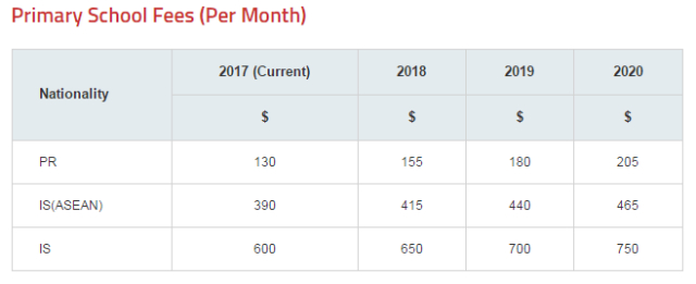 图为新加坡公立小学每月学费表,源于新加坡教育部网站截屏。IS(ASEAN)指来自东盟国家的国际学生;IS指来自其他国家的国际学生,中国的小留学生属于IS。币种为新加坡元(1新加坡元约合人民币4.9元)。