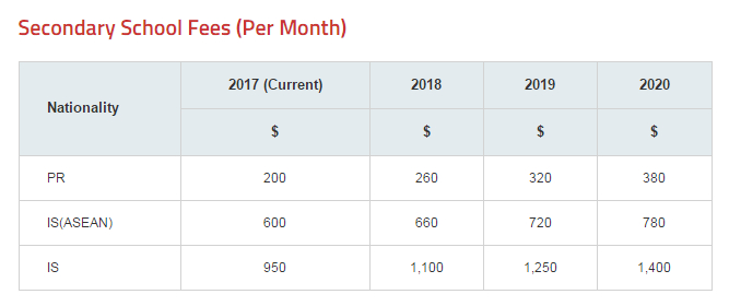 图为新加坡公立中学每月学费表,源于新加坡教育部网站截屏。