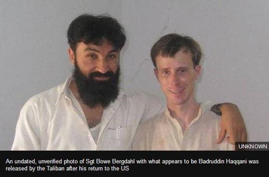 ▲伯格达尔回到美国后,塔利班公布了他与“哈卡尼网络”成员的合照,但该照片未经证实。(BBC)