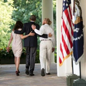 ▲图为玫瑰花园仪式结束后的奥巴马和伯格达尔父母。