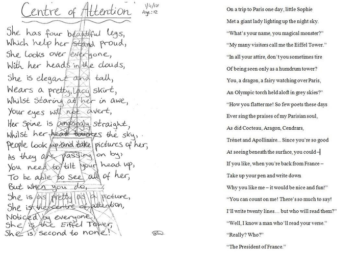今年4月,索菲在巴黎参观埃菲尔铁塔时,难抑激动之情,作诗一首并寄给了法国大使馆。在她生日当天,马克龙总统给她的回诗写道,“读到你对巴黎灵魂的赞美,我万分激动。在这个时代,写诗的人少之又少…我知道有一人一定读了你的诗,那就是法国总统”。