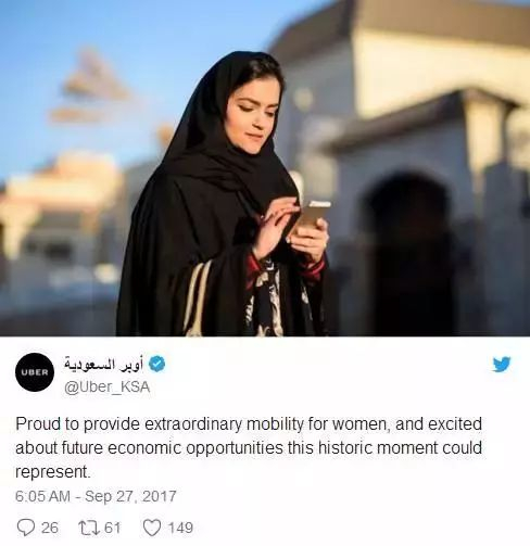 沙特优步也发表推文:为向女性提供特别服务感到骄傲,为这一历史性时刻带来的经济机遇感到兴奋。
