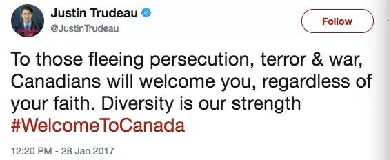 那些希望逃离迫害、恐怖主义还有战火的人们。不管你有何种信仰,加拿大人都欢迎你们。多元化是我们力量的源泉。