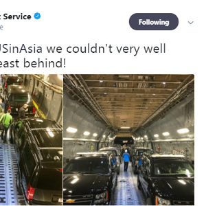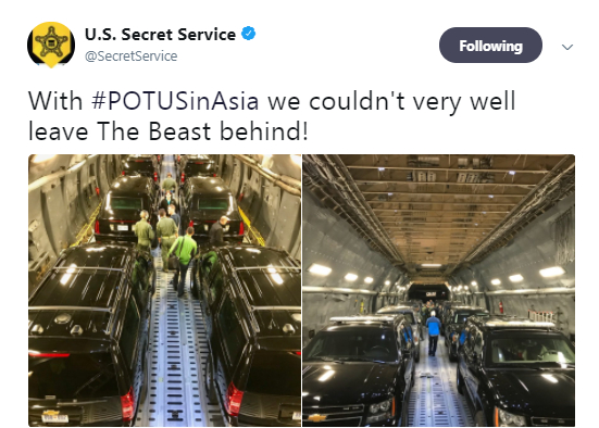 特朗普出访亚洲 座驾“野兽”随行 地球日报 2017.11.0521:59 关注 随着美国总统特朗普和夫人共同出访亚洲,当地时间11月4日,美国特勤局在其官方社交账号上公布了总统的座驾“野兽”随其出行的照片。 图片配文:“总统去往亚洲也不能把‘野兽’落下。” 据了解,“野兽”将和特勤局使用的其他几辆汽车一同被空运至亚洲。这辆特殊设计的凯迪拉克豪华轿车不仅能够抵御撞击、导弹攻击和化学武器攻击,并且内部还装有可用于输血的储备血液以及其他急救医疗设备。