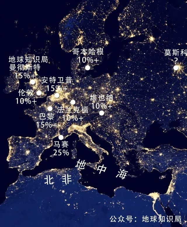 根据一些非官方统计,欧洲各座名城的穆斯林比例都很高。一向和北非过从甚密的马赛名列榜首,有25%左右;法国巴黎、比利时安特卫普、英国曼彻斯特的穆斯林比例都超过了15%;伦敦、法兰克福、哥本哈根、维也纳、阿姆斯特丹则均超过了10%。