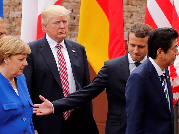 集体合影时他大嘴一张就当着默克尔的面指责“德国人十分无耻,向美国倾销汽车”,场面一度十分尴尬。