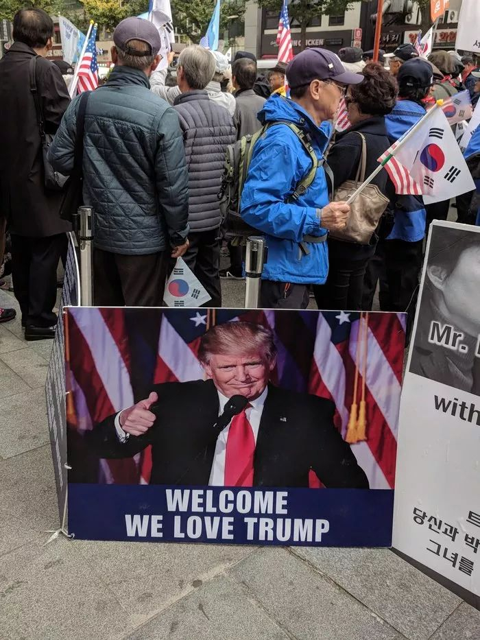 韩国政府在机场鸣礼炮21响欢迎特朗普。从机场出来到青瓦台,一路上都有穿着传统服饰的韩国军乐队护送特朗普的专车,很像是古代帝王出巡的场景。
