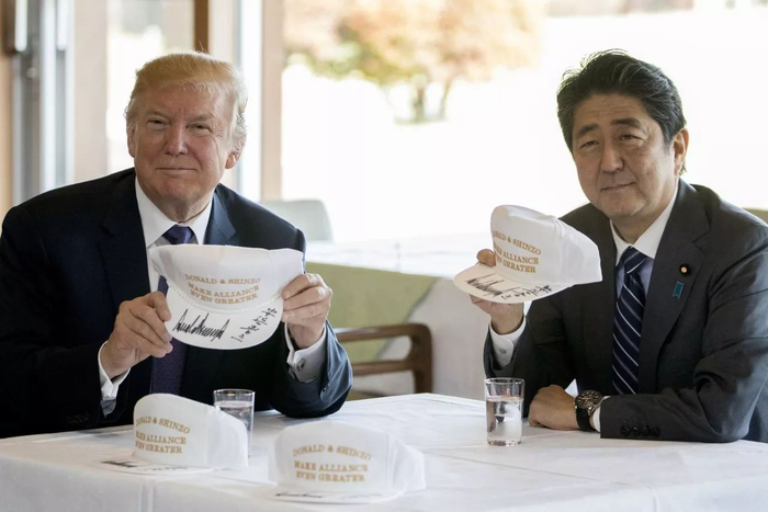 安倍还特地做了几顶白帽子,上面印着“唐纳德和晋三,一起让日美同盟更伟大”,用了特朗普竞选口号“让美国更伟大”的梗。