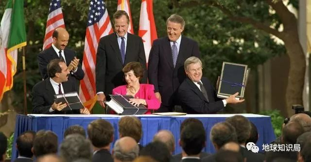 1989年初,终于在美国的大力推进下,美加墨三国签署了北美自由贸易协定,正式建立了北美自由贸易区。