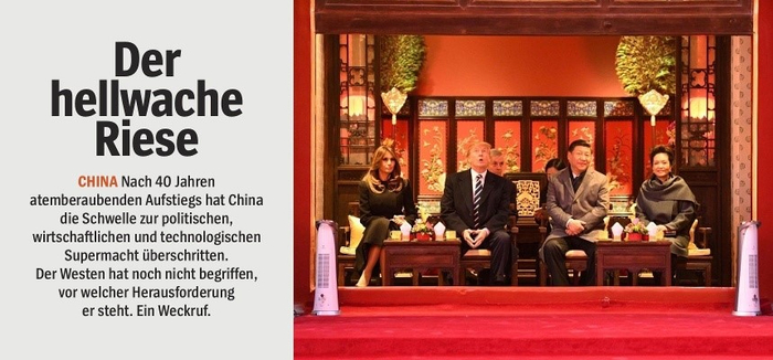 翻到头版文章页,川普惊诧,梅拉尼亚严肃,一旁的习主席夫妇则怡然自得。以 “觉醒的巨人”为题,川普访华和世界地图的不同视角为切入点,拿破仑金句“沉睡雄狮”为结尾,中国崛起已改变世界格局,将取代美国开创新时代的线索贯穿始终。