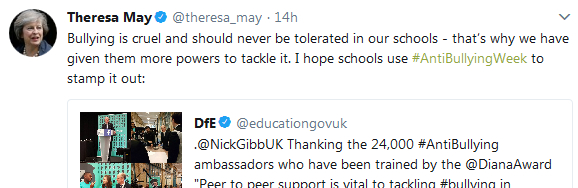 此外,在自己的社交媒体上,特蕾莎·梅还转发了有关反对校园欺凌的推特,希望在英国反校园欺凌周中,给予更多帮助,解决欺凌问题。