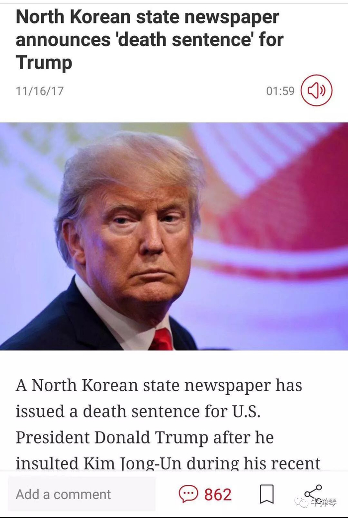 [牛弹琴按:你看,特朗普被朝鲜人民判死刑了吧,想一想,他可能也是死有余辜,一个虫豸不如的老疯子、爱财如命的铜臭,竟胆敢对天上的太阳指手画脚。尤其是说他爱财如命,刻画得真是入木三分。这句话,估计让写下了“蚍蜉撼大树、可笑不自量”的韩愈都自愧不如,用语还是没有朝鲜同志深刻啊]
