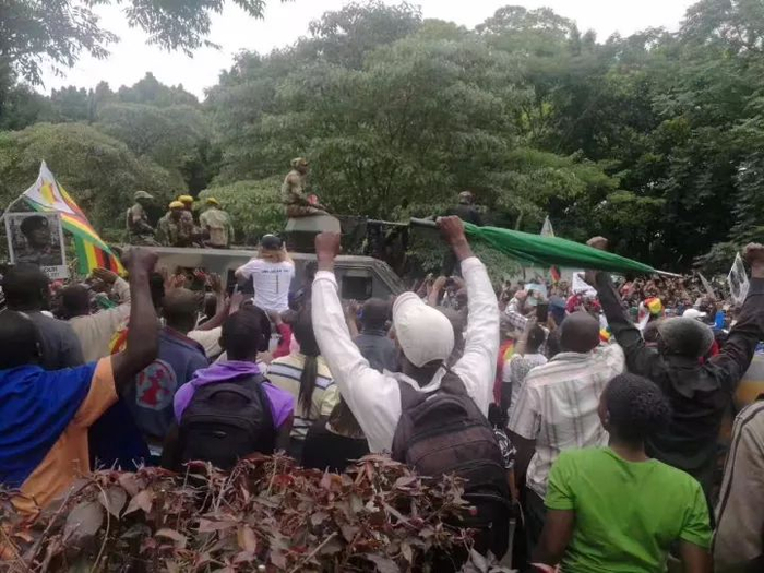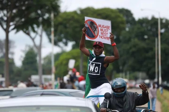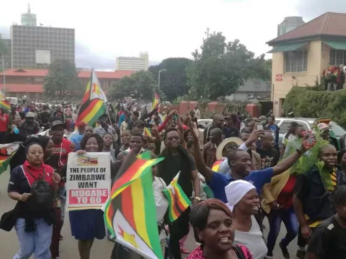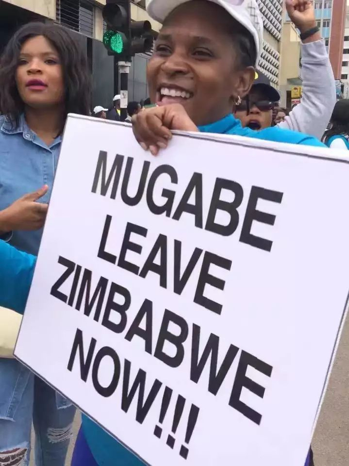 人们举着“穆加贝立刻从津巴布韦滚开”的标语牌