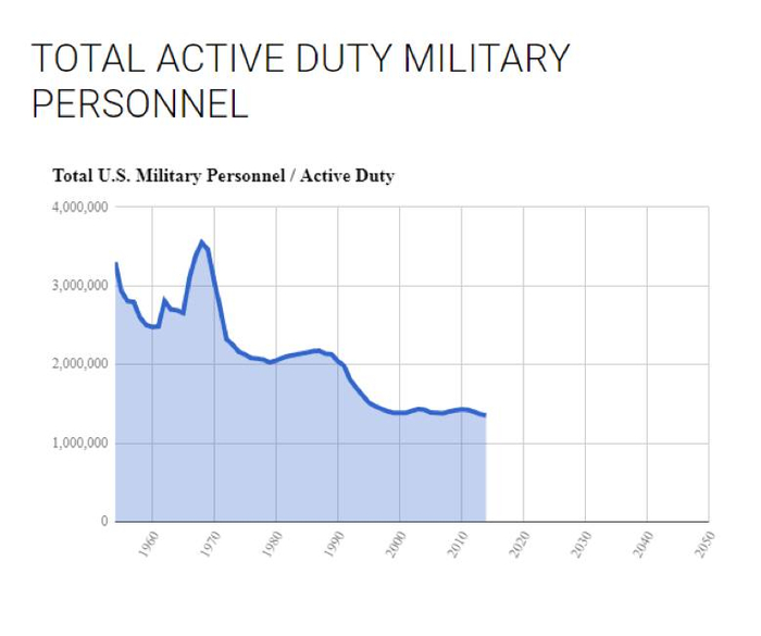 首先,人不够用。七十年代的美国一心只想着要从越南的泥沼里抽身,却没有想到日后的反恐战争会把战线拉得如此之长。从下图中我们可以看到,美国军队总人数于1968年达到顶峰,350+万人,而此后开始逐年递减,自二十一世纪以来一直维持在130-140万人之间。志愿入伍的人近年来越来越少,美国陆军2016年3月发现将近2600个战斗岗位在服役人员期满之后没有后续人员跟上,陆军预计到2018年时,其规模将从2015年的48万人跌至45万人。