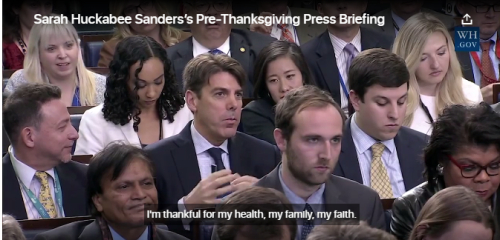 事情缘起于桑德斯在20日的新闻发布会宣布的新规矩。她说,她感谢在场的每一位记者,感谢她的家人、感谢她的信仰,感谢诸多为美国奉献的各行各业人士。她随即表示,既然她已经分享了她的感恩,各位记者应效仿其行为,“这才公平”,桑德斯说。