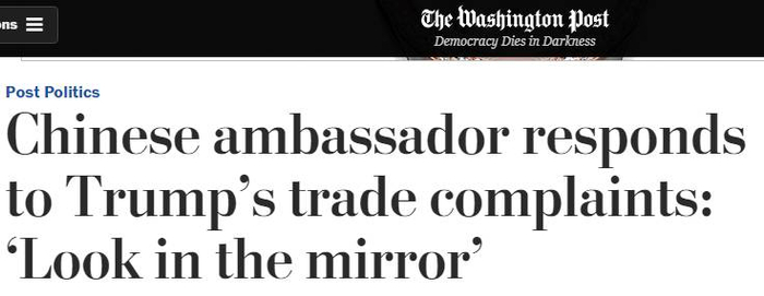《华盛顿邮报》在标题中引用了崔天凯大使的“照镜子”说法