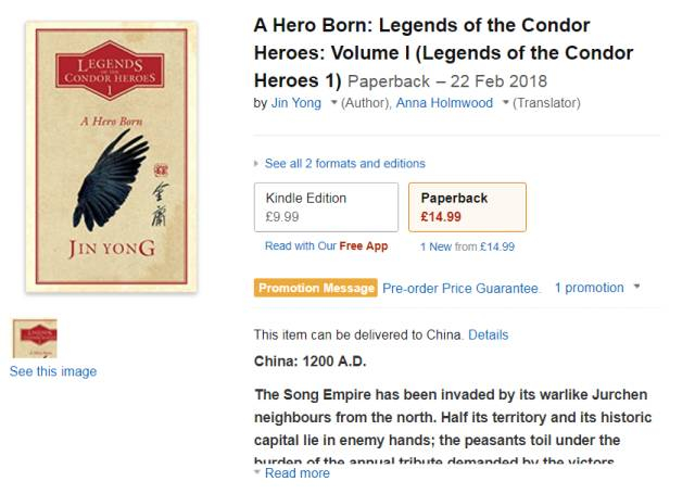 这次的“射雕”三部曲的首部《射雕英雄传》第一卷已经译出,正在进行最后阶段的校对,将由英国的MacLehose Press在明年2月出版,目前已经在亚马逊上开始预售,纸质版的价格是14.99英镑。