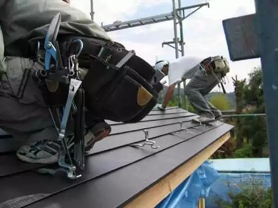 STEP13,屋顶墨绿色的柏油防水卷材上面,安装长条的屋面板板材罩面。屋面板材上的少量镀锌钢制件,为将来屋顶安装太阳能电池板做准备。