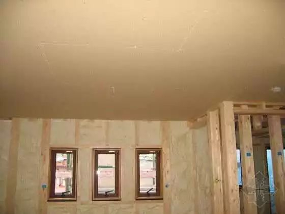 STEP16,室内天棚位置保温材料下面,采用双面防火石膏板罩面施工。