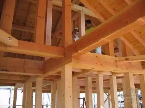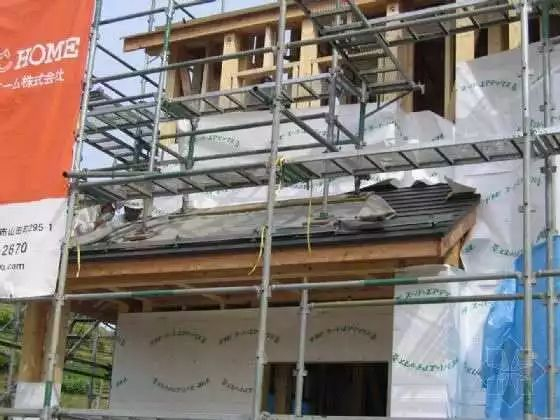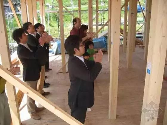 住宅屋顶已经铺放安装了结构合板屋面板, 现为屋盖下方,准备举行日本的“上栋式”-相当于中国的“上梁”仪式。这个仪式起源于中国,日本保留得最完好。
