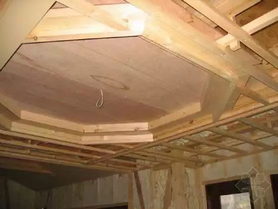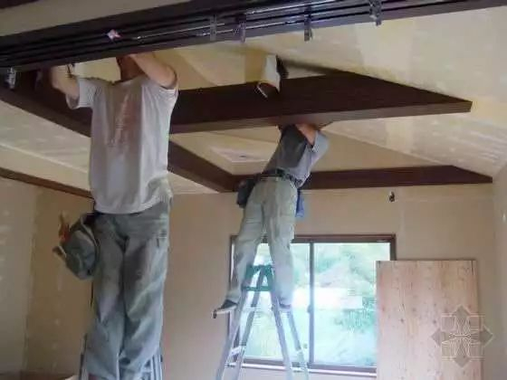 STEP17,逐渐要开始內装了。室内某房间,天花板位置的装饰施工现场。
