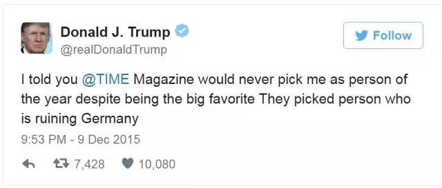 2015年《时代》周刊的年度风云人物,授予了德国总理默克尔,正在全力竞选总统的特朗普,就很愤愤不平说: