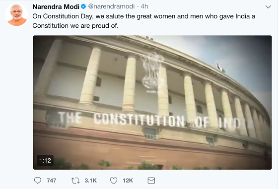 26日早些时候,莫迪在推特中发表了一段视频纪念宪法日并致敬了为印度带来宪法的人们。