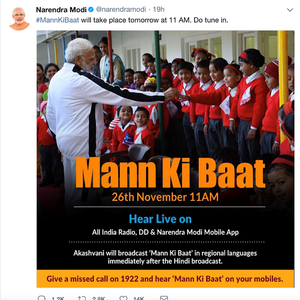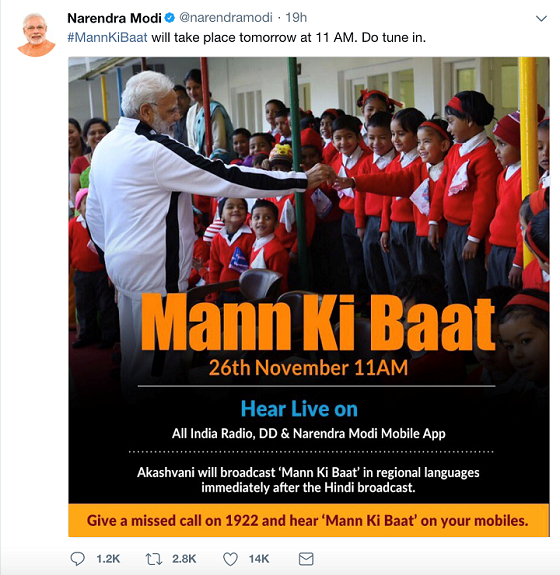 周日(26日),印度总理莫迪参加了Mann Ki Baat广播直播。早在直播前一晚的周六(25日),莫迪就已经在推特上发出了预告,呼吁大家守在广播与“莫迪APP”前。
