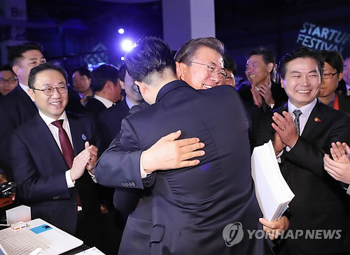 演讲结束后,文在寅参观了韩国风险企业博览会,并与参展企业人员热情拥抱。
