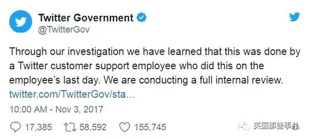“经过我们的调查,我们发现这是一位Twitter客户支持员工,在离职的最后一天做出的操作。”