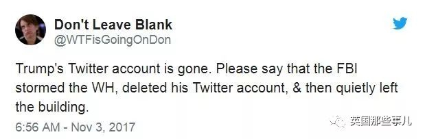 “川普的推特账号不见了。请告诉我这是FBI攻入了白宫,删除了他的账号,然后偷偷离开了……”