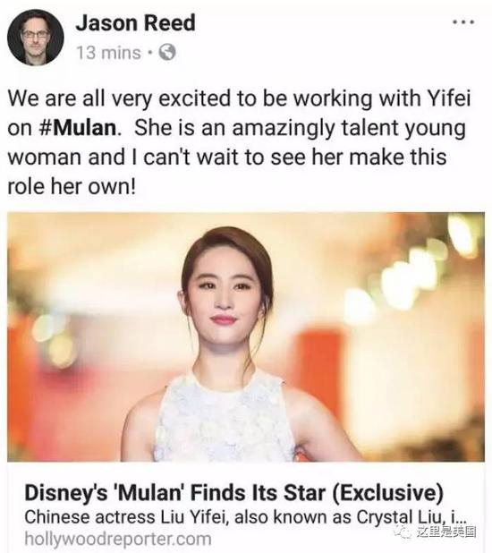 “能和刘亦菲合作《花木兰》这部电影实在太令人激动了,她是一位才华横溢的青年女演员,我们等不及看到她在电影中的精彩表现了!”
