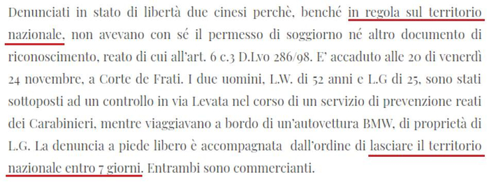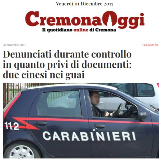cremonaoggi.it网报道,11月24日,在克雷莫纳省(Cremona)科尔泰德夫拉蒂(Corte de Frati)市,两名华人男子因没有随身携带证件而被宪兵警察下达了驱逐令。据悉,两名华人男子年龄分别是52岁和25岁。当晚20时左右,两人正驾驶着一辆宝马轿车在via Levata街上行驶,被正在该处巡逻的宪兵拦下。宪兵以常规检查为由,要求两名华人男子出示证件,但后者既没有随身携带居留,也无法当场出示任何可以证明身份的证件。